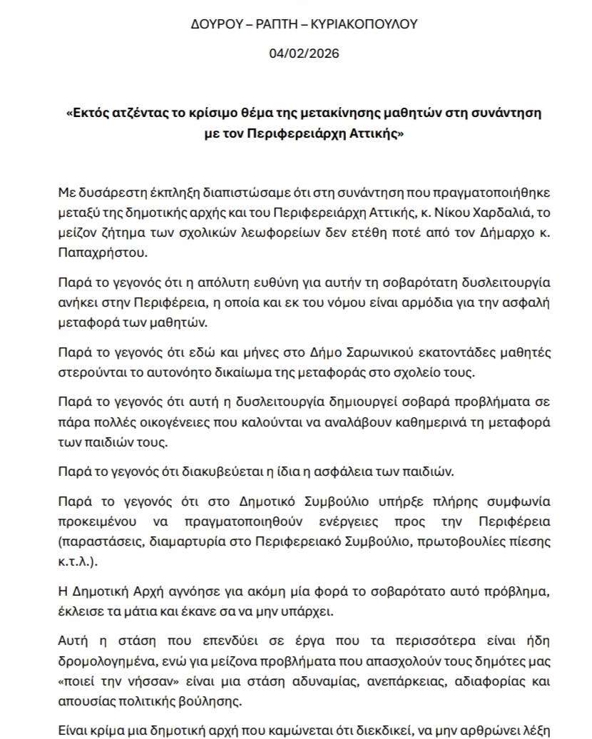 Με αφορμή τη δημόσια ανακοίνωση των Δούρου, Ράπτη και Κυριακόπουλου, επανέρχεται στο προσκήνιο το ιδιαίτερα σοβαρό ζήτημα της μετακίνησης των μαθητών στον Δήμο Σαρωνικού, το οποίο, σύμφωνα με τους ίδιους, δεν τέθηκε στη συνάντηση της δημοτικής αρχής με τον Περιφερειάρχη Αττικής κ. Νίκο Χαρδαλιά.