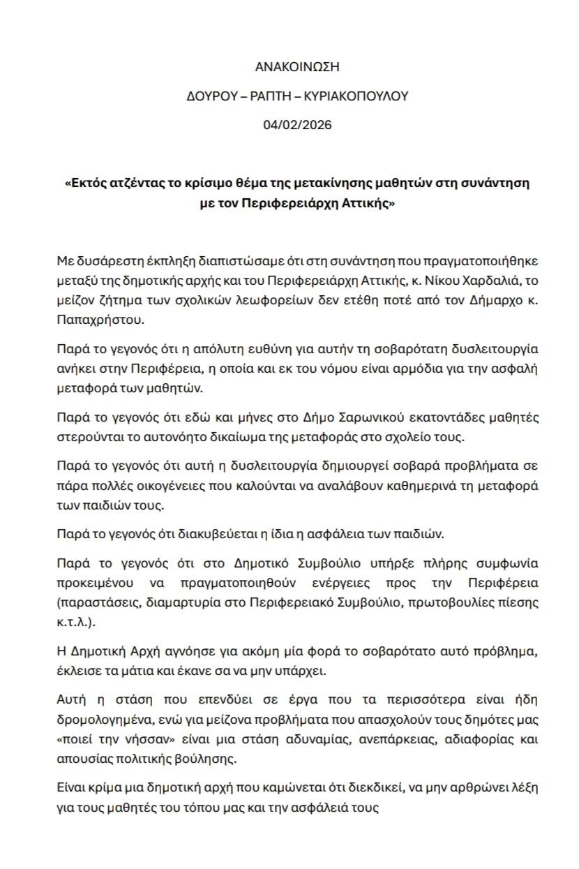 Με αφορμή τη δημόσια ανακοίνωση των Δούρου, Ράπτη και Κυριακόπουλου, επανέρχεται στο προσκήνιο το ιδιαίτερα σοβαρό ζήτημα της μετακίνησης των μαθητών στον Δήμο Σαρωνικού, το οποίο, σύμφωνα με τους ίδιους, δεν τέθηκε στη συνάντηση της δημοτικής αρχής με τον Περιφερειάρχη Αττικής κ. Νίκο Χαρδαλιά.