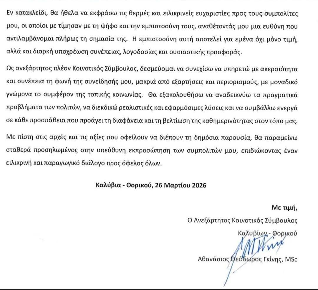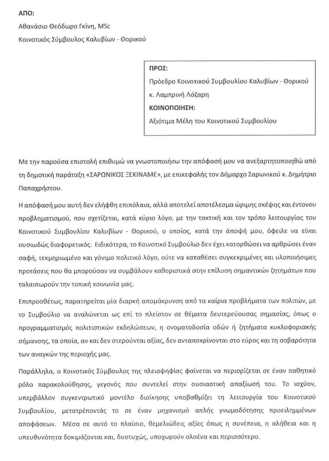 Η επιστολή ανεξαρτητοποίησης του Θανάση Γκίνη